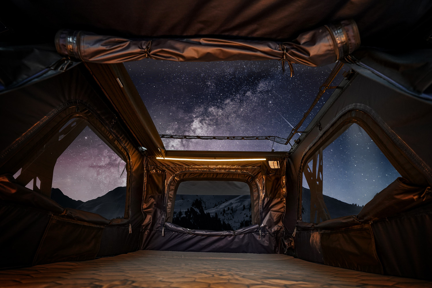 Rondom royale ramen en een groot dakraam overspoelen de tent met licht en openen een indrukwekkend uitzicht in alle richtingen.