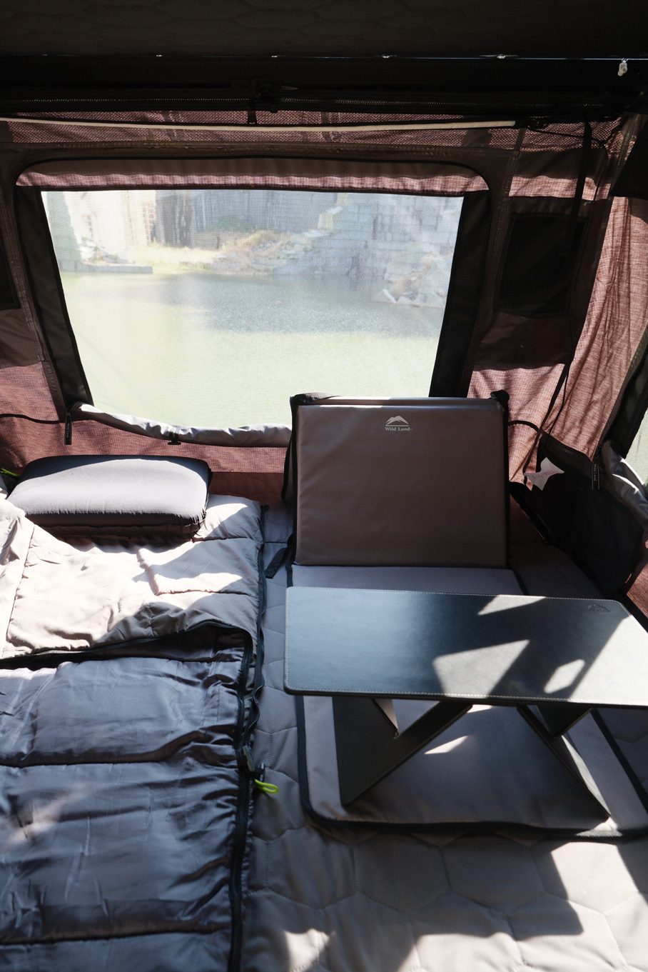 De daktent biedt comfortabel ruimte voor maximaal drie personen.