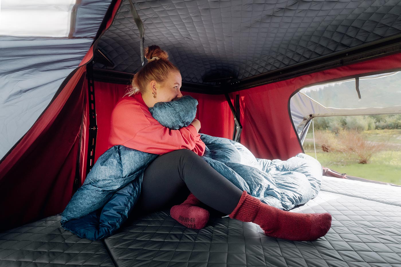 Het speciale ontwerp van de ABS-harde schaal bij de TedPop daktent vermindert niet alleen de luchtweerstand tijdens het rijden merkbaar, maar brengt nog meer voordelen met zich mee. Anders dan bij conventionele hybride daktenten beschermt een vast dak betrouwbaar het slaapgedeelte. Een extra, binnenliggende gewatteerde coating verbetert de functionaliteit verder: Het geeft de harde schaal bijzondere robuustheid en duurzaamheid en werkt tegelijkertijd isolerend. Zo blijft de binnenkant van de tent beter beschermd tegen kou en geluiden van buitenaf – voor een goede nachtrust bij elk weer.